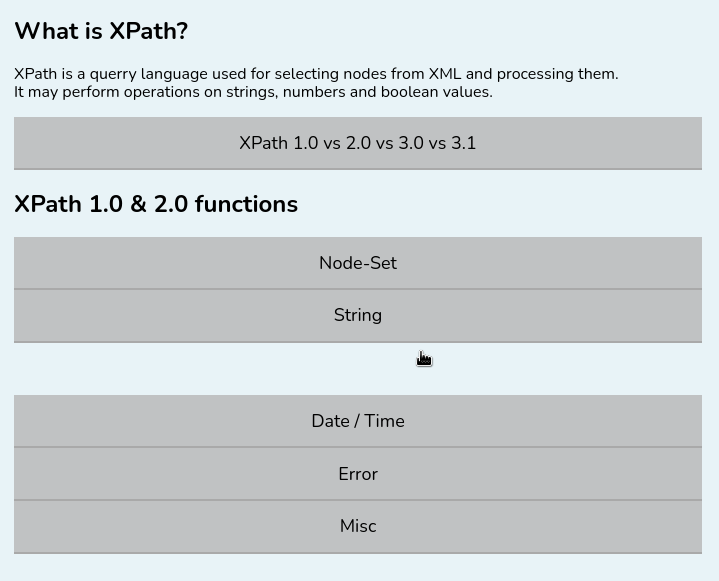 Actual behaviour: On XPath, XSD and XSLT paged when you hover over one of tip menu buttons on right-hand side, it disappears. Bug occurs on Firefox. Buttons look doesn't match the rest of the page.